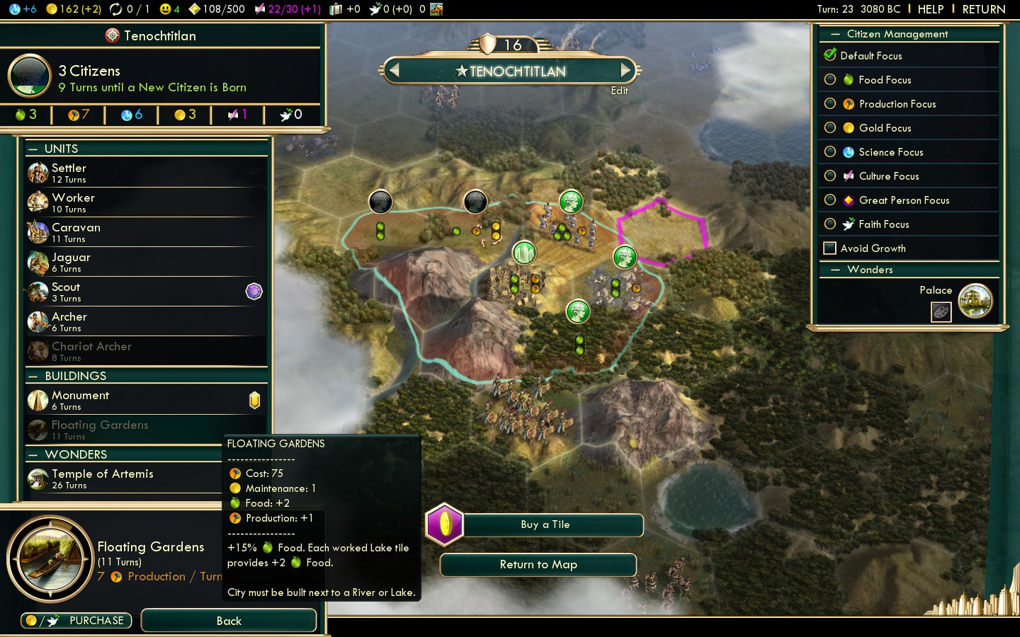 Back to the list of wonders the hanging gardens or the tradition wonder as we might dub it in brave new world greatly helps the population growth in this city. Also you should consider the bonuses that granaries give to deer wheat and banana. Civ5 Aztec Floating Gardens.